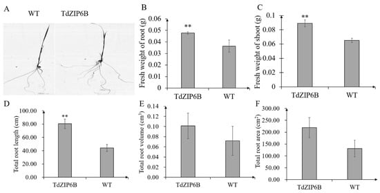 Seedling phenotypes of TdZIP6B-1 overexpression lines (TdZIP6B) and WT plants exposed to normal Zn condition at 14 days. (A) Root phenotype; (B,C) fresh weight of roots and shoots; (D–F) total roots length, volume, and area. Error bars show SE, and the symbol ** indicates statistical differences (p < 0.01).