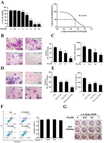 To investigate the effect of PL on RANKL-induced osteoclast formation, BMMs were treated with different doses of PL in the presence of RANKL. As shown in Figure 2B,C, PL significantly inhibited osteoclastogenesis in a dose-dependent manner in vitro, as evidenced by the reduced number and average area of TRAP+ multinucleated (≥3 nuclei) cells. To explore at which stage of osteoclastogenesis PL exerts its suppressive effect, we incubated BMM cells with 1 µM PL at different differentiation time points, as previously described []. The results showed that PL treatment on day three of the five-day culture (late treatment) and treatment on the first two days of RANKL induction (early treatment) had similar and significant inhibitory effect on osteoclast formation, both of which resulted in an approximate 30% reduction in formation of TRAP+ osteoclasts (Figure 2D,E). Notably, consecutive treatment with PL (early and late treatment) had a stronger suppression in the number and average area of osteoclasts (Figure 2D,E). To examine the possible effect of PL on apoptosis, a flow cytometry-based assay was performed. As shown in Figure 2F, the given doses of PL did not affect apoptosis, suggesting that the inhibitory effect of PL on osteoclast formation was not due to its apoptosis-inducing action.