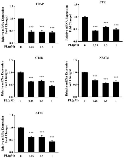 2.3. PL Treatment Inhibited Osteoclastic-Related Genes Expression