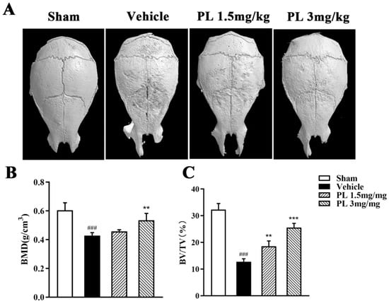 Twenty C57BL/6 male mice (6–8 weeks old) were obtained from Shanghai SLAC Laboratory Animal Co., Ltd. (Shanghai, China). Mice were housed under specific pathogen-free conditions (22 °C, 50–55% humidity, 12/12 h light/dark) with free access to water and food. The animal experiments were approval by the Experimental Committee of Nanjing Normal University (#20201203, approved date: 3 December 2020). A Ti particle-induced calvarial osteolysis model was established per our previous description []. Briefly, the cranial periosteum was separated from the calvarium and Ti particles (30 mg) were embedded under the periosteum at the middle suture of the calvaria. All the animals were randomly divided into four groups: sham group (0.9% saline), vehicle-treated group (Ti particles with 0.9% saline), and PL-treated groups (Ti particles with 1.5 mg/kg/d or 3 mg/kg/d PL, respectively). One day after surgery, PL or 0.9% saline was intraperitoneally administrated once a day for 14 days. When the treatment was ended, the mice were sacrificed, and the calvarias were carefully dissected. After removing the titanium particles, these calvarias were collected for micro-CT scanning and histological analysis.