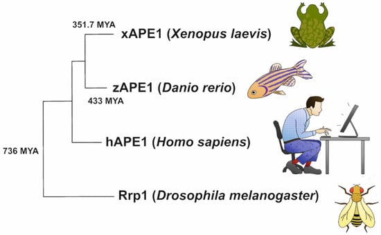 Phylogenetic analysis of the C-catalytic domains of the APE1-like enzymes. Phylogenetic tree was created using the maximum likelihood method (500 replicates) and Jones–Taylor–Thornton (JTT) model by Mega 11 software [44]. Mean divergence times for the species were taken from the TimeTree database and are represented in million years ago (MYA).