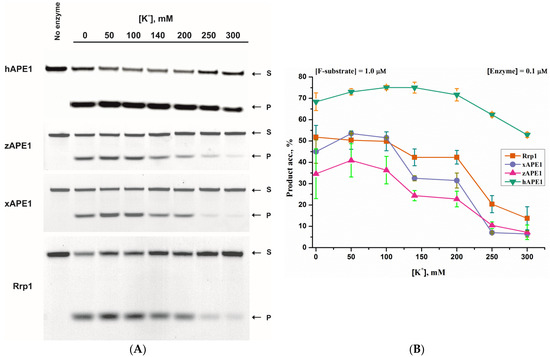 In the case of enzymes zAPE1, xAPE1, and Rrp1, their activity was significantly weaker than that of hAPE1. The enzymes were active even in the absence of K+ ions and their presence enhanced the reaction; the most efficient cleavage occurred in the presence of 50–100 mM K+. The activities of xAPE1 and Rrp1 were approximately equal, and substrate conversion reached ~50%. In the same K+ range, zAPE1 cleaved only ~40% of substrate S to generate product P (Figure 2B). With a further increase in the concentration of K+ ions up to 200 mM, the activity toward the F-site-containing substrate did not change noticeably for hAPE1, but visibly decreased for the other three enzymes and could be ranked as Rrp1 > xAPE1 > zAPE1. With an increase of K+ concentration to 300 mM, the activities of these three enzymes noticeably were diminished. hAPE1 exhibited an almost unchanged level of F-site cleavage between 50 and 200 mM K+, and the activity slightly declined with a further increase of K+ concentration.