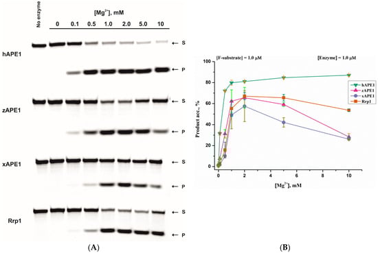 The influence of divalent cations (Mg2+) on the AP-endonuclease activity of the four enzymes. Accumulation of reaction product P from transformation of F-substrate S as determined by PAGE (A). Dependences of the cleavage efficacy on the Mg2+ concentration (B). The error was calculated by averaging each data point over at least three replicates.