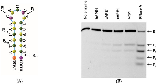 Therefore, a comparative analysis of the endoribonucleolytic hydrolysis of the model RNA substrate (Figure 5A) by the four APE1-like enzymes was performed next. The interaction of the APE1-like enzymes with the model RNA substrate was evaluated both in the absence of divalent metal ions (Figure 5B) and in the presence of Mg2+ (Figure 5C). As revealed by the PAGE assay, four sites of endoribonucleolytic cleavage are presented in the model RNA substrates, which are indicated by arrows in Figure 5A. It was previously found [21] that 3′-5′ endonuclease degradation of RNA could appear only in the presence of cofactor Mg2+ ions. Notably, only during the interaction of hAPE1 with the RNA substrate in a buffer supplemented with 5 mM MgCl2, was the additional 3′-5′ exonuclease product Pexo detected (Figure 5C), implying that the 3′-5′ exonuclease activity of hAPE1 toward the RNA substrate was the most efficient among all of the tested enzymes.