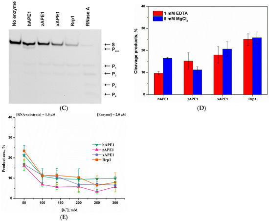 The efficiency of cleavage of the RNA substrate by the four APE1-like enzymes. Positions of the hydrolyzed nucleotides are pointed out by arrows as revealed by RNase A cleavage (A). PAGE analysis of the reaction products in the presence of 1.0 mM EDTA (B) or 5.0 mM MgCl2 (C). A comparison of the efficacy rates of cleavage of the RNA substrate by the four APE1-like enzymes (D). Dependences of the RNA cleavage efficacy on K+ concentration (E). Error was calculated by averaging each data point over at least three replicates. Enzyme = 2.0 μM, RNA = 1.0 μM, and reaction time = 1 h.