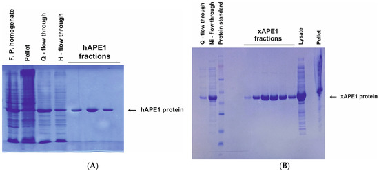 Analysis of the protein purity of the hAPE1 (A) and the xAPE1 (B) proteins by PAGE. The probes containing the homogenate obtained by the French-Press procedure, the cell pellet, the flow-through fractions after the Q-Sepharose chromatography, and the Heparin (hAPE1) or Ni-chelating (xAPE1) chromatography, as well as the protein fractions obtained by gradient elution of protein from the heparin/Ni-chelating columns were analyzed. Coomassie Brilliant Blue R-250 (Sangon Biotech, Shanghai, China) staining was performed for protein visualization.
