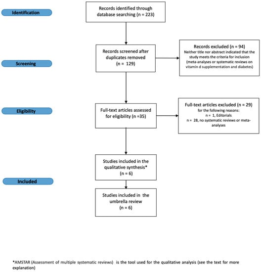 The data of patients with DM were extracted and tabulated according to the result of each trial. Figure 1 shows the flow diagram of the study selection process. To ensure the highest data recruitment possible, initially we searched all the papers regarding vitamin D and cytokines; thereafter we extracted data about the patients with diabetes. The search strings we used permitted us to retrieve 223 bibliographic citations. These were screened, and 129 papers fit the eligibility criteria. Then, ninety-four studies were excluded because they were duplicates, six papers were removed because they were not systematic reviews or meta-analysis and twenty-nine articles were not taken into consideration as they were not pertinent to the aim of our overview. Thus, we finally identified six relevant papers, which were investigated for the details that pertain to this overview of the SRs. Table 1 shows the summary of the AMSTAR assessment. No SR regarding the vitamin D had low-quality results. Hence, we extracted each randomized clinical trials including patients with diabetes from every systematic review. The data from each randomized clinical data are reported in Table 2.