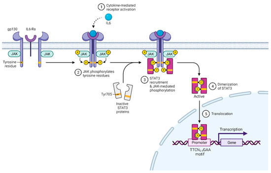 Schematics of cytokine-mediated STAT3 activation. Created with BioRender.com (accessed on 7 September 2021).