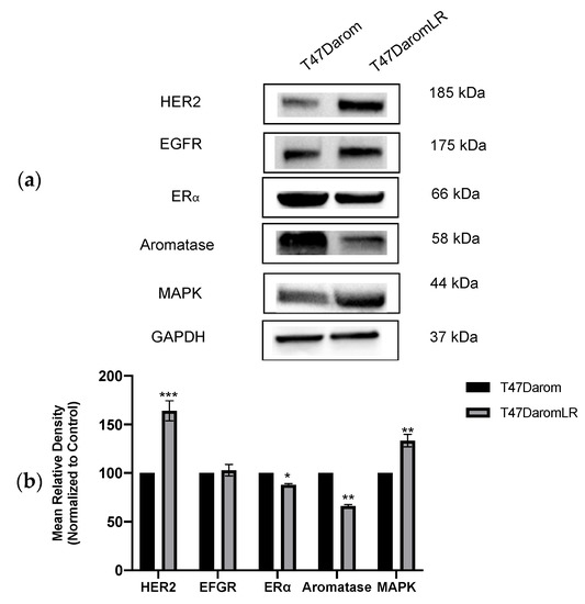 Comparative protein expression profile of letrozole-sensitive cells (T47Darom) versus letrozole-resistant cells (T47DaromLR). (a) The T47Darom and the T47DaromLR cells were assayed by immunoblot with antibodies directed against HER2, EGFR, ERα, aromatase, and MAPK. GAPDH was measured as an internal loading control. (b) Quantitative analysis representing the fold changes of the indicated proteins after normalizing to GAPDH loading control. The T47Darom cells were set to 100%. Student’s t-tests were performed, and treatments were compared to DMSO control. Results are expressed as the mean unit ± SD (*** p < 0.001, ** p < 0.01, * p < 0.05), and data are representative from one of at least three independent experiments.