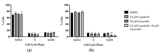 Glyceollin alone and in combination with lapatinib inhibit G1/S and G2/M cell cycle progression in T47DaromLR breast cancer cells. (a) The T47Darom and (b) the T47DaromLR cells were assessed by flow cytometry for cell cycle progression after treatment with the vehicle control (DMSO), 0.5 μM lapatinib, 10 μM glyceollin, and 0.5 μM lapatinib + 10 μM glyceollin for 24 h. Cells were detached, washed, fixed, and stained with PI. Cell cycle analysis was determined as described in the methodology. Student’s t-tests were performed, and treatments were compared to the DMSO control. Results are expressed as a percentage of total cells ± SD (*** p < 0.001, ** p < 0.01, * p < 0.05) of three independent experiments in triplicate.