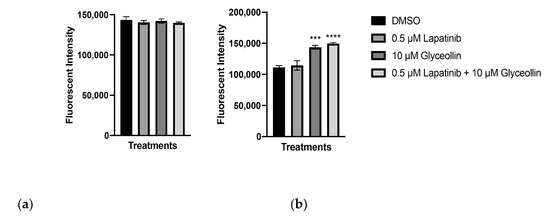 Glyceollin ± lapatinib does not alter the expression of MAPK or HER-2. Both cell lines were cultured in standard growth media and treated for 24 h with DMSO vehicle control, 0.5 μM lapatinib, 10 μM glyceollin, or 0.5 μM lapatinib 10 μM glyceollin as described in the Section 4. Western blot analyses were performed to examine the expression of (a) MAPK and (b) HER-2. Student’s t-tests were performed, and treatments were compared to the control. Densitometry was conducted as previously described. Representative images of the blots are shown below the graphed values.