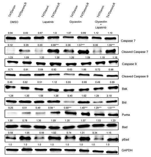 Western blot analysis for apoptosis-related proteins. T47Darom and T47DaromLR cells were exposed to DMSO, 0.5 μM lapatinib, 10 μM glyceollin, and 0.5 μM lapatinib in combination with 10 μM glyceollin for 24 h, and GAPDH was used as the loading control. Densitometry values are indicated above each band, and the treatments were compared to DMSO control for the respective cell lines and normalized to GAPDH loading control. Student’s t-tests were performed, and results are expressed as the mean (*** p < 0.001, * p < 0.05) of a minimum of three independent experiments in triplicate.