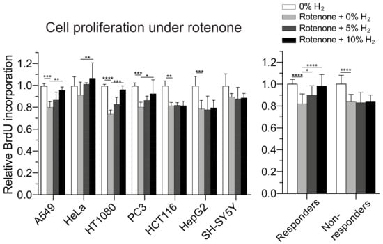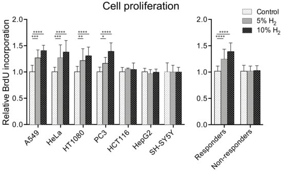 2.1. Hydrogen Promotes Cell Proliferation in Four of Seven Cancer Cell Lines