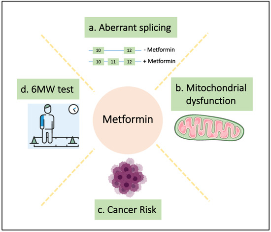 Metformin restores multiple phenotypes in DM1. (a) Loss of exon 11 in INSR gene is associated with insulin resistance in DM1 patients and metformin restores the inclusion of this exon [117]; (b) metformin treatment restores the impaired mitochondrial metabolism of DM1 fibroblasts [71]; (c) DM1 patients have an increased cancer risk and metformin reduces this risk in DM1-T2D patients [114], and (d) finally, metformin improves the 6-min walk test in a clinical trial [116].