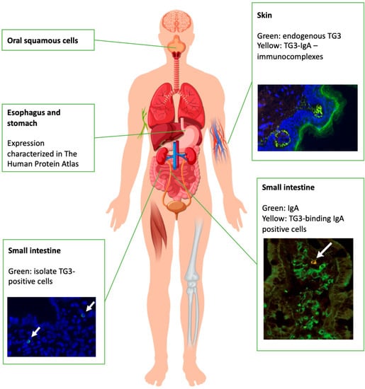 Known sites of human TG3 expression (left panel) and reported sites of immunological responses against TG3 (right panel) [,].