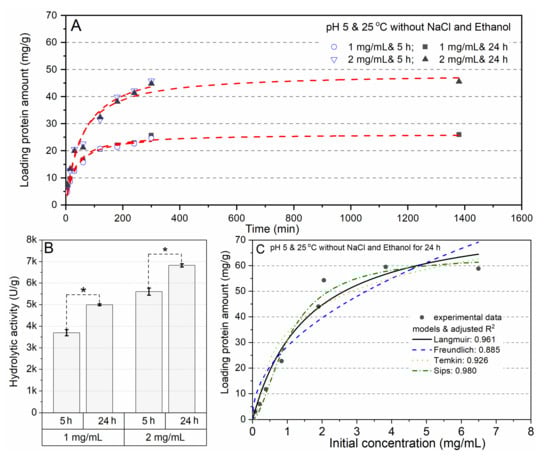 - Blanco, R.M.; Terreros, P.; Muñoz, N.; Serra, E. Ethanol improves lipase immobilization on a hydrophobic support. J. Mol. Catal. B Enzym. 2007, 47, 13–20. [Google Scholar] [CrossRef]