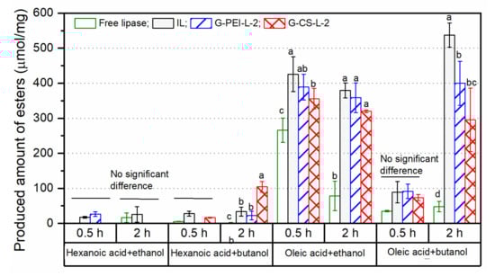 - Urrutia, P.; Arrieta, R.; Alvarez, L.; Cardenas, C.; Mesa, M.; Wilson, L. Immobilization of lipases in hydrophobic chitosan for selective hydrolysis of fish oil: The impact of support functionalization on lipase activity, selectivity and stability. Int. J. Biol. Macromol. 2018, 108, 674–686. [Google Scholar] [CrossRef]