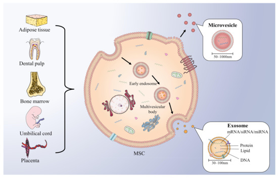 Various sources of MSCs and the generation of EVs. MSCs are mainly originated from adipose tissue, dental pulp, bone marrow, umbilical cord, and placenta. Inward budding formed early endosomes matured to form multivesicular bodies, which fuse with plasma membrane release exosomes. Exosomes (30–150 nm) are EVs contains miRNA, protein, lipid, and DNA. Microvesicles (50–1000 nm) are EVs released directly from the plasma membrane.