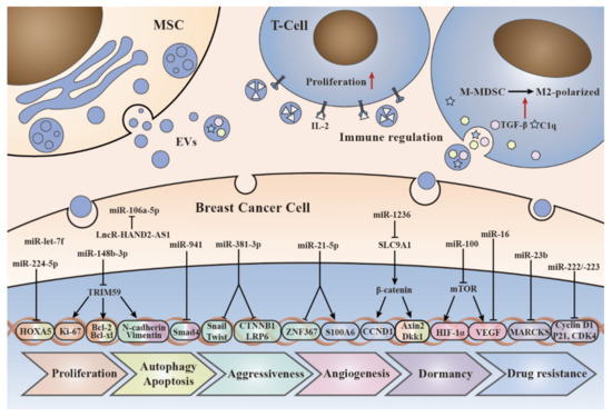 Therefore, understanding MSC-EV-mediated mechanisms between cancer cells and their microenvironment in cancer progression is of great significance for exploring new approaches to cancer treatment. In this section, we describe the exact roles of MSC-EVs in cell proliferation, autophagy, apoptosis, aggressiveness, angiogenesis, immune regulation, dormancy, and drug resistance of BC.