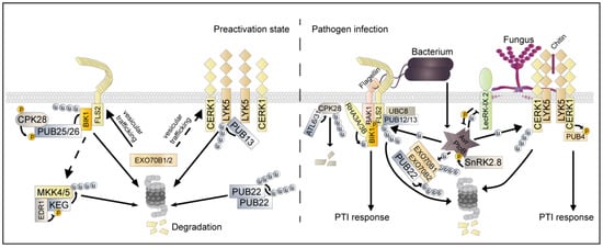 FLS2, one of the most well-studied PRRs, perceives bacterial flagellin (or the epitope flg22) and rapidly recruits BRASSINOSTEROID INSENSITIVE 1-ASSOCIATED KINASE 1 (BAK1) as coreceptor [,] and relays the signaling through associated with receptor-like cytoplasmic kinases (RLCKs) [,]. PRRs, coreceptors, and RLCKs often form multiprotein PRR complexes known as receptorsomes []. The perception of flg22 induces the formation of FLS2 and BAK1, which in turn phosphorylates RLCK BIK1 and thereby leads to BIK1′s dissociation from the FLS2–BAK1 complex; this dissociation then activates diverse downstream signaling events [,,]. The maintenance of an appropriate abundance of FLS2 on the cell membrane surface is critical for flagellin-triggered immune signaling [,]. EXO70B1 and EXO70B2, which are exocyst complex subunits and function with soluble N-ethylmaleimide-sensitive factor attachment protein receptor (SNARE) complexes, play key roles in regulating PM-localized FLS2 abundance via membrane-trafficking machinery []. Accordingly, the ROS production and callose deposition induced by flg22 were found to be significantly compromised in exo70B1, indicating that EXO70B1 and EXO70B2 function as positive regulators in PTI by regulating the trafficking of FLS2 to the PM []. Furthermore, EXO70B2 was identified as a target of the E3 ubiquitin ligase PLANT U-BOX22 (PUB22). Interestingly, treatment with flg22 potentially inhibited the autocatalytic ubiquitination activity of PUB22 and resulted in its accumulation, dampening immune responses by mediating the ubiquitination of EXO70B2 and promoting its degradation via the 26 S proteasome (Figure 1) [,].
