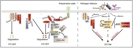 Another PM-localized protein, RPM1-INTERACTING PROTEIN4 (RIN4) (a negative regulator in flg22-triggered immunity), is guarded by the CNL proteins RPS2 and RPM1. Recently, RIN4 was shown to be involved in AvrRpm1-induced FLS2 degradation [,]. MAPK activation is one of the typical downstream responses in both PTI and ETI signaling []. It was reported that MEKK1–MKK1/MKK2–MPK4 is monitored by CNL SUMM2 and TNL RPS6 (Figure 2) [,]. In addition to SUMM2, MEKK2 is also required for activation of the defense responses in the mekk1 mutant and functions upstream of SUMM2 []. MEKK2 stabilizes SUMM2 by counter-regulating SUMM2 ubiquitination and degradation (Figure 2) [].
