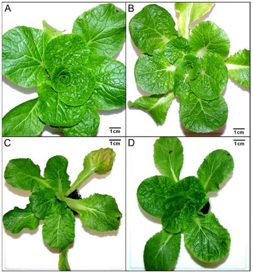 Figure 1. Typical plants of Brassica rapa subsp. pekinensis after 21 days of growth in 100-ppb O3 in different light spectra: (A) yellow light (sodium lamp, YL), (B) white light (WL), (C) light with a dominant blue component (WBL) and (D) light with a dominant red component (RGBL).