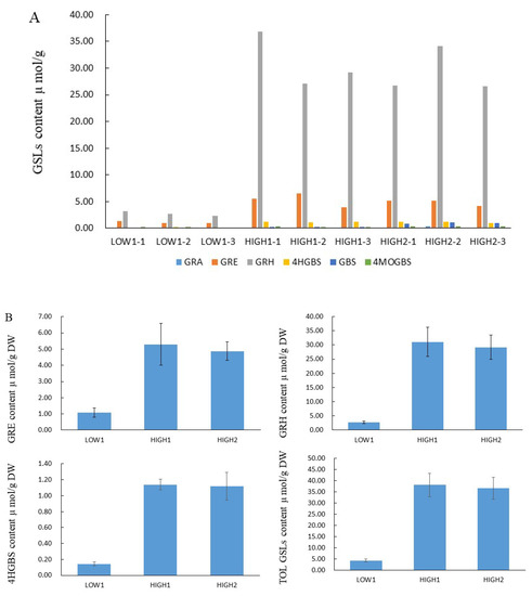 We analyzed GSLs components and their content by using the HPLC method (Figure 1, Table S2). Totally, we identified out six GSL components, which included three aliphatic glucosinolates (GRA, GRE, and GRH) and three indolyl glucosinolates (4-hydroxyglucobrassicin: 4HGBS, glucobrassicin: GBS, and 4-Methoxyglucobrassicin: 4MOGBS). The aliphatic GSLs were prominent, and the proportion of aliphatic GSLs accounting for the total GSLs content was 89.67% in LOW1, 98.53% in HIGH1, and 93.31% in HIGH2. The GRH as the most predominant component had an average value of 2.74, 31.04, and 29.14 μmol/g dry weight (DW) in LOW1, HIGH1, and HIGH2, respectively. The highest values of GRH in HIGH1 was almost 13 times that of the lowest value in LOW1. As for GRE, as the component of second highest content, its content in HIGH1 was almost 4-fold higher than that in LOW1.