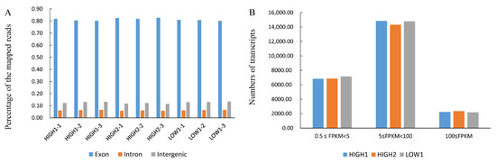 Transcriptome analysis of fleshy taproots of three radish genotypes. (A) Percentages of the mapped reads distributed in different sites (intron, intergenic, and exon) of genes in HIGH1, HIGH2, and LOW1. The x axis represents three replicates of the sequenced varieties—namely, HIGH1, HIGH2, and LOW1. The y axis shows the percentage of mapped reads distributed in different sites of genes. (B) Numbers of transcripts with different FPKM values in the roots of the three cultivars. The x axis represents the sequenced genotypes—namely, LOW1, HIGH1 and HIGH2. The y axis shows the numbers of transcripts. The different colors represent the different FPKM values.