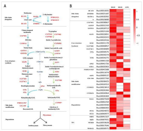 Totally, we identified sixteen genes functioning in GSL core structure formation in three radish taproot samples (Figure 3B). Among these genes, there were seven DEGs (RsCYP79F1, RsGSTF9, one copy of RsGGP1 (Rsa10019051), RsSUR1, RsUGT74C1, one copy of RsST5b (Rsa10034275), and RsAPK1) that showed extremely markedly and repeatedly higher expression in HIGH1 and HIGH2 compared with LOW1 (Figure 3B and Figure 4A); however, CYP83A1 was not detected in the three cultivars. Among the genes involved in side chain modification, only two copies of RsGSL-OH were significantly differentially expressed among three radish genotypes. The GSL-OH locus is responsible for biosynthesis of the hydroxylated alkenyl GSLs 2-hydroxybut-3-enyl GSLs, whose production is dependent on the presence of both AOP2 and MAM1 [56].
