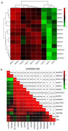 Differential expression of key GSLs pathway-related genes and their correlations in different radish samples. (A) Heatmap visualization of the relative gene expression levels in different radish taproots. The legend shows the up- and downregulation expression pattern that was maintained in each sample. (B) The Pearson’s coefficient (r) and correlation significance (asterisks) are elucidated in a symmetric matrix prepared using the same variables as in A, with the addition of the GRH and GRE content. The location of the variables in the heatmap are based on the results of hierarchical clustering; the negative and positive correlations are shown in green and red squares, respectively, and the r values are shown in the squares. *, **, and *** indicate significance at p ≤ 0.05, p ≤ 0.01, and p ≤ 0.001, respectively; n.s., not significant.
