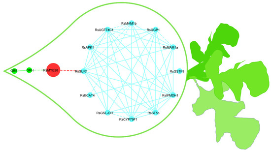 Putative metabolic network for the synthesis of GSLs in radish fleshy taproots. The blue lines represent the relationships among GSLs biosynthesis genes; the red lines represent the relationships between RsMYB28 and GSLs biosynthesis genes; the green lines represent the relationships between genes and GSLs. The correlation strength according to the r coefficient ranges was used to determine whether the lines are shown as solid or dashed (dashed: 0.7 ≤ r ≤ 0.85; solid: r > 0.85). The red nodes represent transcription factors, the blue nodes indicate GSLs biosynthesis genes, and the green nodes are GSLs.