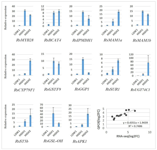 Validation of the expression of 13 differentially expressed genes in LOW1, HIGH1, and HIGH2 fleshy taproots by qRT–PCR. The x axis represents the three cultivar taproots. The y axis shows the relative expression of one specific gene to the reference gene RsGAPDH, and the expression of genes in LOW1 was set to “1” as a control. The last panel shows the results from the RNA-seq/qRT–PCR correlation analysis (bottom right) expressed as log2-fold changes in the low-GSLs vs. high-GSLs genotypes; a significant positive correlation was found between the fold changes in expression, as determined by Pearson’s correlation (R2 = 0.75; p < 0.001).