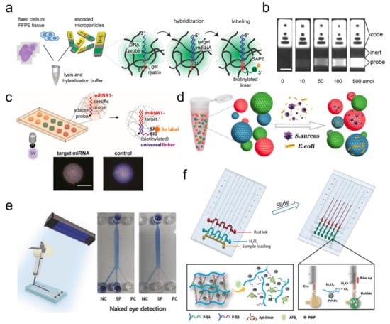 Nucleic acids, exemplified by DNA oligonucleotides, are highly programmable materials that have many modification techniques available to be integrated to numerous materials including semi-conductive materials and polymers. With these oligonucleotide probe-incorporated hydrogels, researchers developed various sensors for many types of oligonucleotide analytes, such as mRNA and viral RNA. One frequently used target analyte is microRNA (miRNA) because many miRNAs are known to be connected to the pathogenesis of diseases including cardiovascular diseases [], nervous disorders [], and cancers []. The aim is to analyze multiple miRNAs simultaneously using multiplex assays while maintaining sufficient specificity and sensitivity. In this regard, encoded microparticles with either shape [] or graphical barcodes [,] proved highly effective and many initial proof-of-concept results were reported []. More recently, the topic is moving towards translational research for point-of-care (POC) device development. Efforts to increase compatibility with practical clinical samples [] and detection sensitivity [,], and to integrate with microfluidics for robust readout [,] are being made (Figure 2a–d).