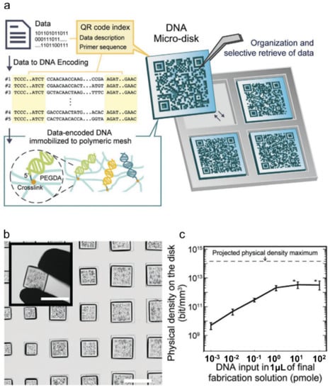 However, for the next step of industrial application of DNA data storage, Choi and colleagues developed a DNA micro-disk fabricated by incorporating data storing DNA material on QR-encoded hydrogel microparticles [] (Figure 4). These QR-coded microparticles work as a data management system for access. They demonstrated that these micro-disks could work as a write-once-read-many (WORM) memory. They showed that the multiple file library, which included maps and texts, can be stored into primer sets, stored in a DNA micro-disk, and then recovered selectively through PCR amplification against the primer set designated for the targeted file upon demand.
