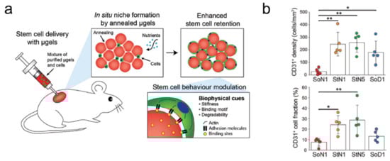 In vivo delivery of microporous annealed particles (MAPs) for wound healing. (a) Schematic of subcutaneous injection of MAP for effective vascular regeneration. (b) Results of injecting MAPs with four distinctive compositions (SoN1, StN1, StN5, and SoD1), leading to vascular endothelial cell (CD31+) regrowth in injection site; adapted with permission from []. Copyright 2019 Wiley.