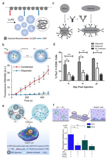 Examples of hydrogel-based artificial cells. (a,b) Liquid–liquid phase separation using polymer–peptide hybrid. (a) Oligopeptides were used as stickers while dextran backbones were used as spacers. These hybrid materials effectively formed membrane-less organelle-like droplets. These droplets were able to contain enzymes and carry out phase-separated reactions; adapted with permission from []. Published under CC-BY license (4.0). (c,d) Artificial antigen presenting cells (aAPCs) for antigen-specific T cell stimulation. (c) Hydrogel microparticle-based aAPCs were fabricated by incorporating anti-CD28 antibody for T cell co-stimulation and MHC Db Ig Dimer for antigen-specific stimulation. (d) T cells were stimulated in vivo more effectively by ellipsoidal aAPCs than spherical aAPCs; adapted with permission from []. Copyright 2015 Wiley. (e,f) Artificial signal transfer between artificial cells and mammalian cells. (f) Alginate artificial cells were used to encapsulate Coumarin and produce 7-Hydroxycoumarin, which, in turn, was transferred to HepG2 cells to induce fluorescence; adapted with permission from []. Copyright 2021 Wiley.