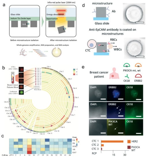 (a–c) Whole-genome sequencing of captured CTCs. Pulsed lasers were used for retrieving breast cancer patient-derived CTC. (a) Retrieved cells were processed for downstream whole-genome profiling (b) and analysis of copy number alteration of tumorigenesis-related gene loci (c); adapted with permission from []. Copyright 2019 Wiley. (d,e) Schematic of antibody-crosslinked polymer post for capturing circulating tumor cells (CTCs) from blood sample; scale bars are 50 μm. (e) In situ molecular profiling of CTCs from breast cancer patient; scale bars are 10μm and adapted with permission by the authors of []. Copyright 2020 RSC.