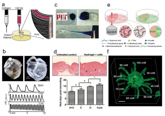 Although there are many tissue types targeted for artificial fabrication, the most widely studied tissue types for 3D-printed hydrogels are skin, cartilage, cardiac, and neural tissues. For skin tissues, cell types, such as fibroblasts and keratinocytes, are being used for bio-inks directly printed on the wound site [,]. Cartilage tissue cells, such as chondrocytes, can be mixed with hyaluronic acid, one of the major components of cartilage tissue, and other materials (i.e., PLA) to form printable bio-inks to form mechanically enhanced structures [,,]. For cardiac tissues, many cell types, including vascular endothelial cells, cardiomyocytes, and smooth muscle cells, are either seeded on pre-printed hydrogel scaffolds or printed simultaneously [,,]. A recent study advanced this particular field to the point where collagen-based 3D printing of whole human heart is now possible (Figure 9a,b). As for neural tissue fabrication, it was shown that human cortical neural stem cells can be grown in a matrix consisting of alginate, carboxymethyl chitosan, or agarose []. The resulting tissue showed effective neural cell-like GABA expression after 10 days of in vitro proliferation. In another example, a bio-ink made of mouse neural stem cells embedded in PCL was used for generating aligned fibers for guided cell growth and lengthened neurites by stereolithography and electrospinning [].
