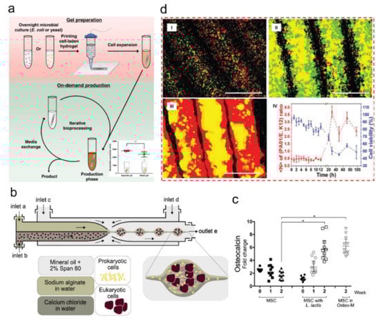 - Johnston, T.G.; Yuan, S.-F.; Wagner, J.M.; Yi, X.; Saha, A.; Smith, P.; Nelson, A.; Alper, H.S. Compartmentalized microbes and co-cultures in hydrogels for on-demand bioproduction and preservation. Nat. Commun. 2020, 11, 563. [Google Scholar] [CrossRef]