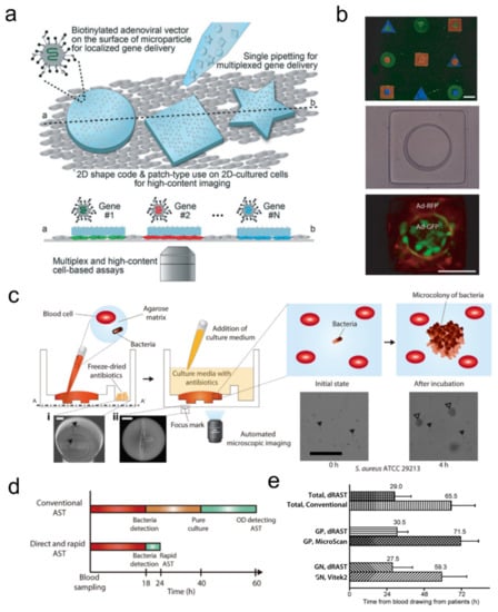 Microorganism-laden hydrogels for drug screening. (a) Schematic of encoded viral micropatch for multiplex cellular assays. Each shape-coded particle is conjugated with adenovirus with designated gene for localized gene transfer; adapted with permission from []. Copyright 2017 RSC. (b) Demonstration of hierarchically assembled shape-encoded hydrogel micropatch for dual gene delivery; adapted with permission from []. Copyright 2018 AIP (c–e). Direct detection of antibiotic resistance from positive blood culture bottle by image tracing of agarose-embedded bacteria cells; adapted with permission from []. Published under CC-BY license 2017. (c,d) Illustration of direct blood detection of single-bacteria microcolony by antibiotic-laden agarose hydrogel-embedding of blood. (e) Comparison of test duration between conventional AST and direct AST.