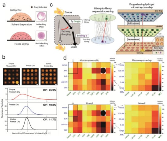 Chemical drug-laden hydrogel microparticles for drug screening. (a,b) Uniform drug loading into prefabricated microparticles. (a) Comparison of drying uniformity between solvent evaporation-based drying and freeze drying. (b) Demonstration of fluorescent rhodamine-B drying on hydrogel microparticles with different drying methods. Coefficient of variation was used for measuring drying uniformity; adapted with permission from []. Copyright 2017 Wiley. (c,d) Schematic (c) and demonstration (d). Drug-releasing hydrogel microarray for high-throughput drug combination screening. (d) Sequential anti-cancer drug combination assay against BT-20 cancer cell line. The result shows good agreement between conventional 96-well experiment and microarray chip-based method; adapted with permission from []. Published under CC-BY license 2018.