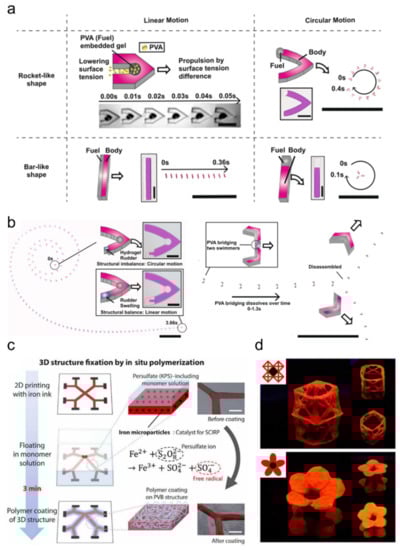 (a,b) Schematic and demonstration of programmable Marangoni microswimmers made of PVA-embedded hydrogel. Embedded PVA is used as fuel, which reduces the local surface tension, leading to propulsion without external stimuli; adapted with permission from []. Copyright 2021 NPG. Published under CC-BY license 2021. (c,d) Schematic (c) and demonstration (d) of 3D hydrogel transformation of 2D pen drawing. After surface tension-based floating of the 2D pen-drawn PVB film, embedded iron microparticles induce local polymerization surrounding the PVB film; adapted with permission by the authors of []. Copyright 2021 AAAS.