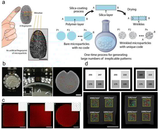 When designing hydrogels with polymer additives, these additives are commonly embedded inside the hydrogel’s 3D matrix. However, in some cases, polymer additives could create new functionalities with simple changing of their deposition pattern. Bae and colleagues invented duplication-resistant human fingerprint-like wrinkled taggants based on polymer microparticles coated with silica [] (Figure 15a,b). These wrinkled microparticles, although fabricated in batches, have individual unique wrinkle patterns with a staggering 10135 coding capacity. Evidently, these particles are difficult to replicate even by the original producer, thus having a fingerprint-like authentication capability when applied on products. Generating these microscale wrinkle patterns relied on the instability generated between the polymer matrix and the coated silica layer during the shrinking process. This created semi-random wrinkling patterns on the polymer microparticle surfaces. They were also able to create maze-like structures by guided wrinkling [] (Figure 15c). Additionally, further-improved security of these fingerprints was possible with gray-scale lithography [] (Figure 15d).
