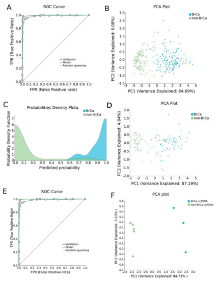BrCa-specific methylation biosignature built using AutoML. (A) ROC curves of training (blue line) and validation (green line) models. (B) Supervised PCA plot (i.e., only considering the selected relevant biomarkers) presents separation between BrCa (blue) and healthy tissues (green) within the training group. (C) Out-of-sample probability density plot (i.e., probability predictions when samples were not used for training) depicts discrete distributions among studied classes of the training group. (D) PCA plot presents separation between BrCa (blue) and healthy tissues (green) within the validation group. (E) ROC curves of training (blue line) and external validation (green line) models and (F) PCA plot presents separation between BrCa ccfDNA (blue) and healthy ccfDNA (green) within the external validation group. Abbreviations: BrCa = breast cancer, ROC = receiver operating characteristic, PCA = principal component analysis.
