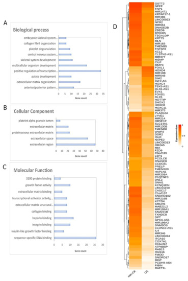 Differential methylation analysis comparing OA and healthy tissues. Gene ontology analysis of top 400 DMGs in the aspects of (A) biological process, (B) cellular component and (C) molecular function analysis. (D) Heatmap plot of top 100 DMGs comparing OA and healthy tissues. Abbreviations: OA = osteoarthritis, DMGs = differentially methylated genes.