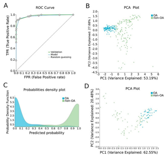 OA-specific methylation biosignature built using AutoML. (A) ROC curves of training (blue line) and validation (green line) models. (B) Supervised PCA plot (i.e., only considering the selected relevant biomarkers) presents separation between OA (blue) and non-OA healthy tissues (green) within the training group. (C) Out-of-sample probability density plot (i.e., probability predictions when samples were not used for training) depicts discrete distributions among studied classes of the training group. (D) PCA plot presents separation between OA (blue) and non-OA healthy tissues (green) within the validation group. Abbreviations: OA = osteoarthritis, ROC = receiver operating characteristic, PCA = principal component analysis.