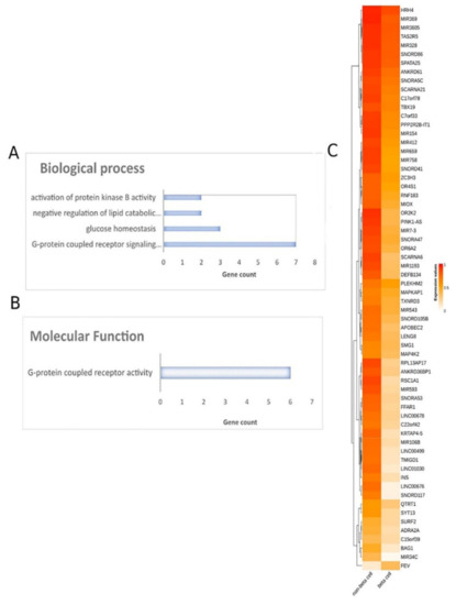 Further, all DMGs identified were subjected to functional analysis. Molecular function analysis showed an enrichment in the G-protein-coupled receptor activity and signaling pathway, glucose homeostasis, the negative regulation of lipid catabolic process and the activation of protein kinase B activity (Figure 5). Reactome pathway analysis did not lead to any pathways. The PPI network of the 66 DMGs is presented in Supplementary Materials.