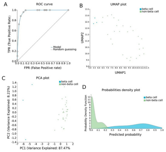 Pancreatic β-cell-specific methylation biosignature built using AutoML. (A) ROC curve of model. (B) UMAP plot shows separation between pancreatic β-cells (blue) and other tissues (green). (C) Supervised PCA plot (i.e., only considering the selected relevant biomarkers) presents separation between pancreatic β-cells (blue) and other tissues (green). (D) Out-of-sample probability density plot (i.e., probability predictions when samples were not used for training) depicts discrete distributions among studied classes. Abbreviations: ROC = receiver operating characteristic, PCA = principal component analysis, UMAP = uniform manifold approximation and projection.