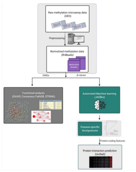 DNA methylation is a well-characterized epigenetic mechanism participating in the regulation of gene expression, and is related to a variety of normal functions [1]. Aberrant gene methylation contributes to the pathophysiology of human diseases, such as cancer [2], autoimmune disorders [3] and diabetes [4]. The detection of alterations in DNA methylation, either on tissues or in liquid biopsies, has been involved in the initiation [5,6], progression [7,8,9] and response to the treatment of several diseases [10,11,12] and, thus, it is thought to hold valuable information for their clinical management. Genome-wide methylation analyses enable the study of a vast number of CpG sites and produce high-dimensional datasets that can be exploited for a deeper understanding of the contribution of methylation in human pathology. They also offer the opportunity to build specific biosignatures for personalized clinical solutions of clinical importance.