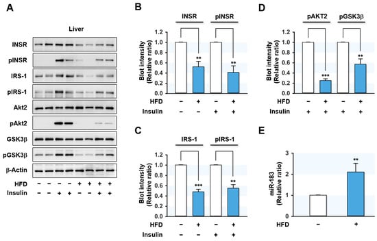 HFD led to impairment of insulin signaling and induced miR-183-5p in the mouse liver. C57BL/6N male mice were fed either NFD or HFD at the age of 6 wk for 14 wks. Mice were injected intraperitoneally with either insulin (1U/kg body wt) or the vehicle for the last 30 min prior to euthanasia. (A) Representative immunoblots (2 from 8 mice/group) of insulin signaling molecules (INSR, IRS-1, Akt2, and GSK3β) and their phosphorylations (pINSR, pIRS-1, pAkt2, and pGSK3β) in the liver are shown. (B–D) The respective densitometry measurements, normalized versus β-Actin. (E) The miR-183-5p levels from the liver of HFD-fed mice (closed column) and NFD-fed mice (open column) were determined using qRT-PCR. The results in immunoblots and qRT-PCR are presented as a relative ratio, normalized to NFD controls set to one. Results are presented as means ± SEMs. **, p < 0.01; ***, p < 0.001 vs. controls (NFD).